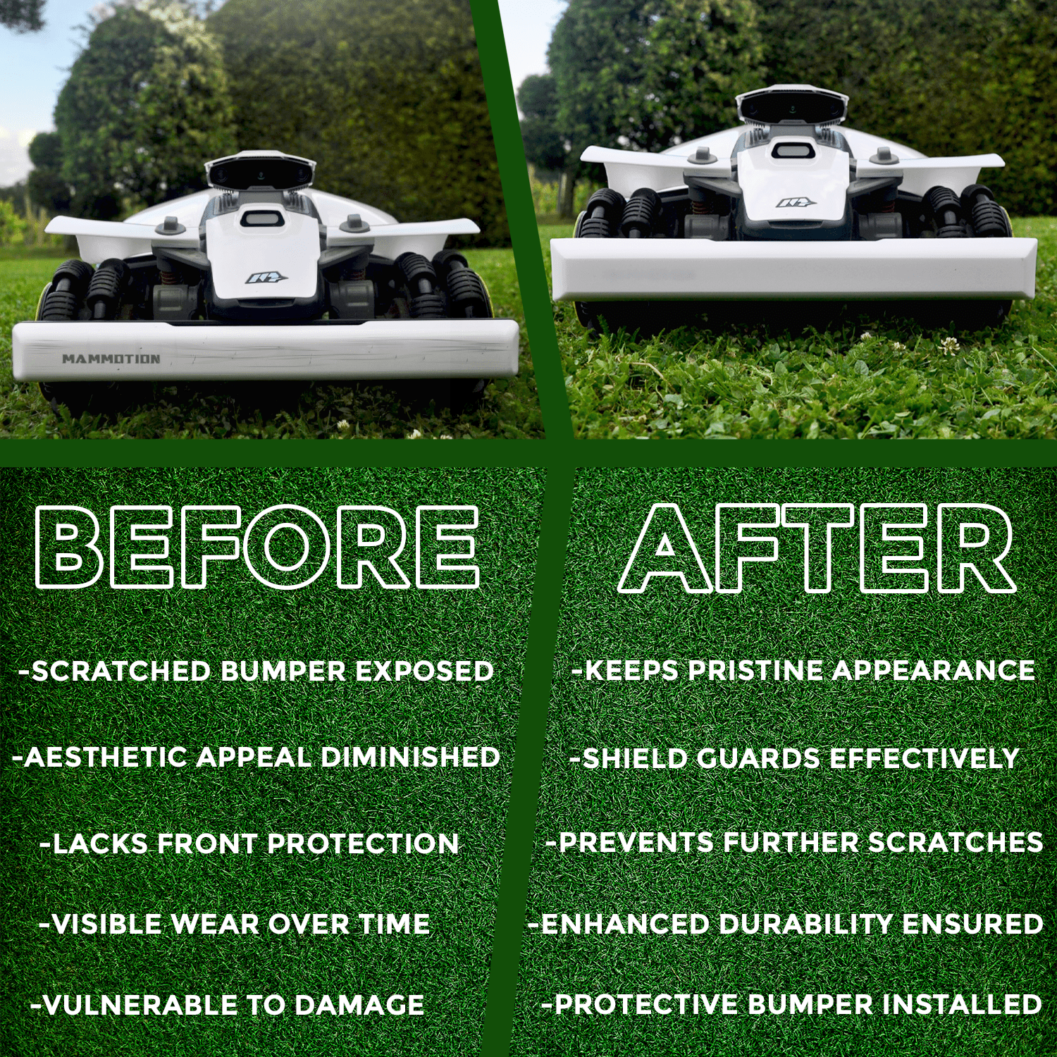 Schützen Sie Ihre Mammotion Luba Mini mit unserem Frontschutz – einer robusten und präzise angepassten Erweiterung, die sowohl Schutz als auch Stil bietet.